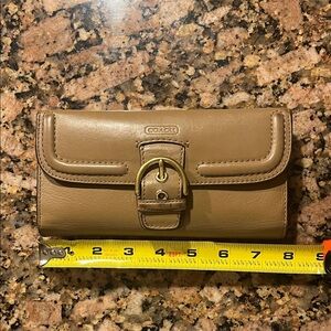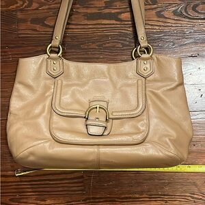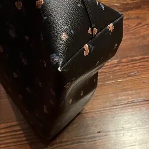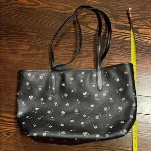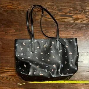 Coach black leather tote with delicate floral print. Double shoulder straps for easy wear with interior pocket/zipper and full zipper on top. Some wear on 3 of the 4 bottom corners, reflected in the price.