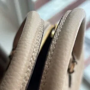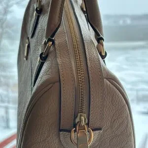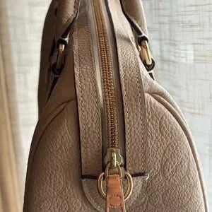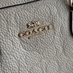 Compact Coach satchel in cream pebbled leather. Includes matching wristlet and detachable strap. Gold-tone hardware and embossed Coach logo. Structured shape for everyday use.