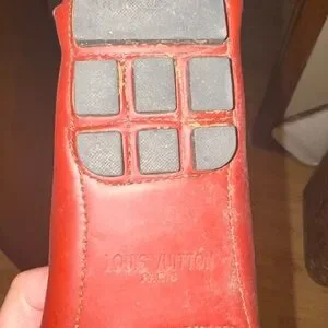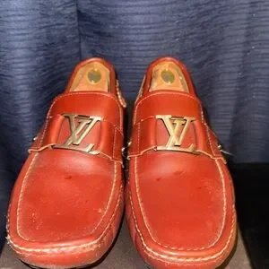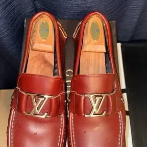 Elegant red loafers with iconic LV logo. Perfect for a sophisticated look.