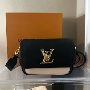 Chic crossbody with signature LV emblem. Sleek black and cream design. Ideal for versatile styling.