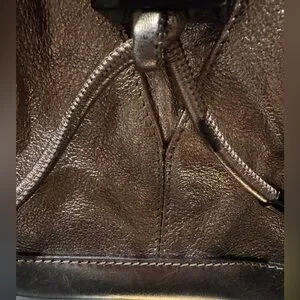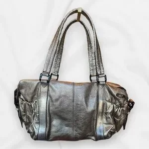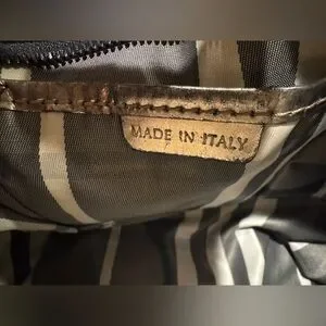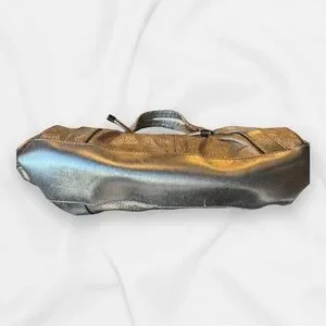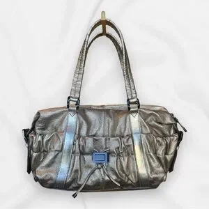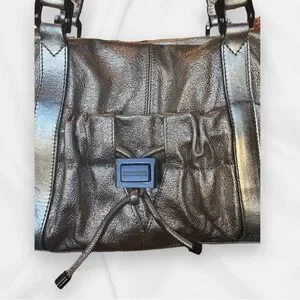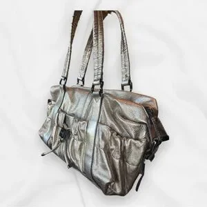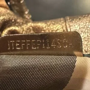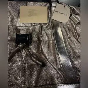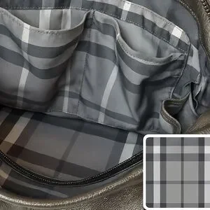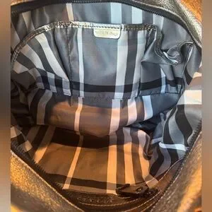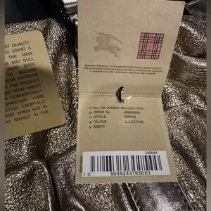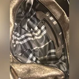 Elegant metallic goldstone leather. Features dual handles. Interior with classic Burberry check pattern.