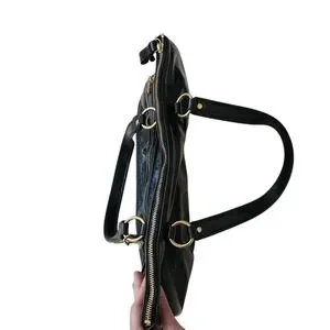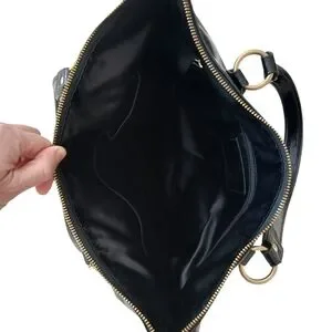 high Shine Patent leather, gold tone hardware, 8 3/4 drop, outside zip, cell pocket, zip top