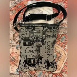 Elegant Coach crossbody with black and cream pattern. Features signature logo and carriage design.