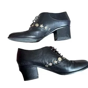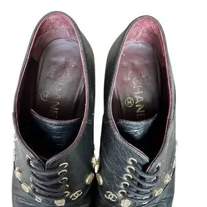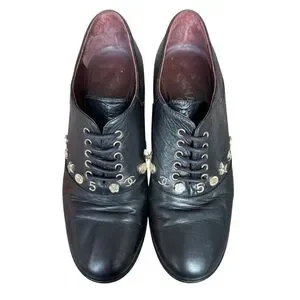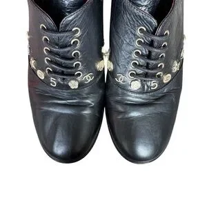 Step into iconic style with these authentic Chanel Lucky Charms Interlocking CC Logo Pumps. Crafted in Italy from supple black leather, these lace-up oxford-style pumps feature a block heel and are adorned with signature gold-tone Chanel charms including the CC logo, No. 5, camellia, clover, and star. A rare and collectible style that makes a bold statement.