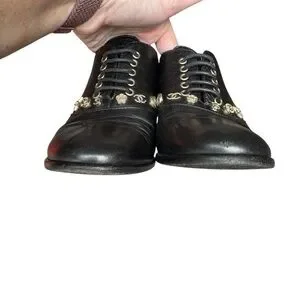 Good pre-owned condition. Leather uppers show creasing and some light scuffs, mostly on the toes. Insoles and lining show wear. Charms are intact and in beautiful condition. Outsoles and heels show wear and light scuffing but remain structurally solid. Still plenty of life left in these statement-making pumps.