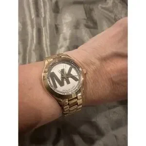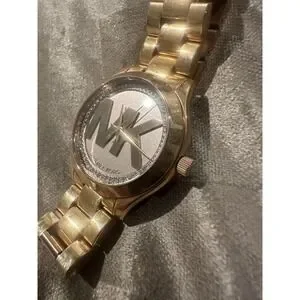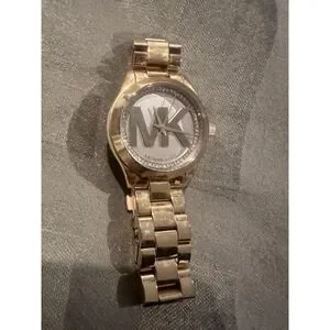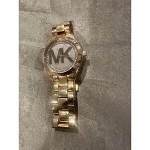 Womens analog bracelet watch in rose gold-tone stainless steel with a silver-tone dial featuring an oversized MK logo and a sparkling inner crystal ring. Needs Battery