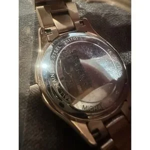 Materials/Specs: All stainless steel construction; water resistance 5 ATM; three-hand display; mineral crystal; link bracelet with fold-over clasp engraved MICHAEL KORS.
