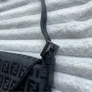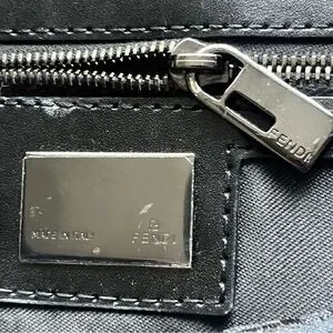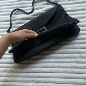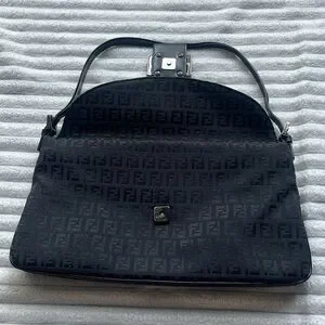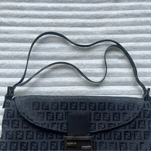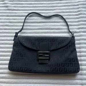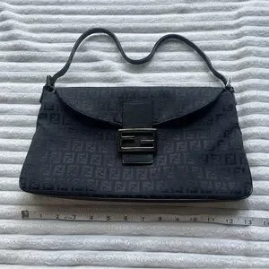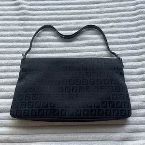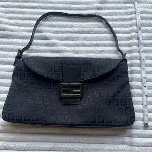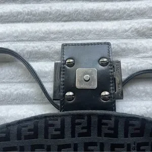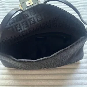 Authentic black Fendi purse. Vintage, purchased in the late 90s. Fabric material with monogram print. The brand calls this style a Baguette bag. Has some minor tarnishing on the hardware, see photos. Strap is partially split but still fully functional. Says Made in Italy on the metallic part on the inside, and on the underside of the buckle. Logo/brand name engravings on the sides of both strap buckles, underside of main buckle, bottom of magnetic clasp, inner metallic tag, zipper pull tab, the head of the zipper, and the underside of the zipper.