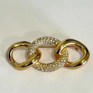 Vintage Christian Dior Triple Loop Rings Gold tone Brooch Rhinestone Pave