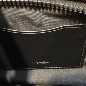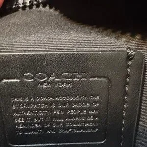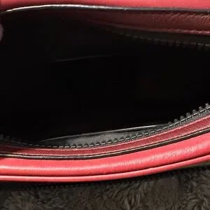 Coach signature tan canvas pouch with red leather trim. Front zip pocket and main compartment for essentials. Compact, stylish, and travel-ready.