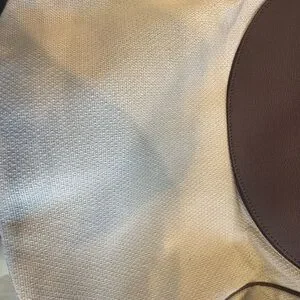 Balenciaga Edition Handbag in Canvas in Leather Trim with Bag. Cream woven canvas body with brown leather flap. Sleek, pared-back design. Versatile neutral tones great for spring and summer. Very small stain at the bottom of the bag. Look at pictures for details