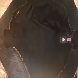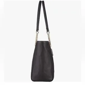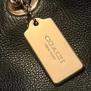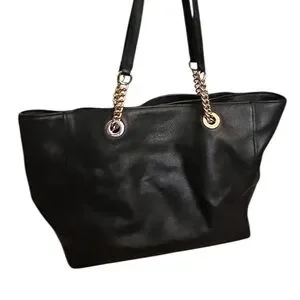 Sleek black leather tote with elegant gold chain details. Perfect for versatile style. Crafted by Coach.
