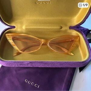 Distinct cat-eye silhouette with translucent amber frames. Slightly angular lenses for a modern retro look. Lightweight acetate construction. Stylish accessory to elevate outfits.