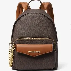 Michael Kors mini backpack in signature MK logo print. Front zip pocket and gold hardware. Includes detachable tan card case with chain. Adjustable tan shoulder straps. Sleek everyday style.