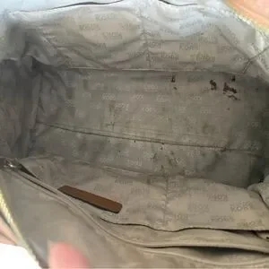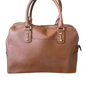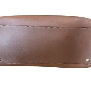 Structured saffiano leather satchel by Michael Kors. Dual top handles and zip closure. Gold MK logo charm and gold-tone accents. Classic tan color for versatile wear. Moderate staining at interior lining. Minor red stain on bottom. Minor black stain on backside exterior.