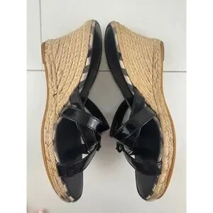 Burberry Haymarket Check Espadrille Wedge Sandals Black Patent Leather 38 7.5 8