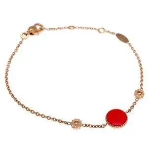 This is an authentic Dior bracelet in rose gold. The bracelet features a delicate chain adorned with a circular charm embellished with red enamel and small round diamonds, creating a chic and elegant design.