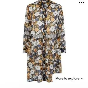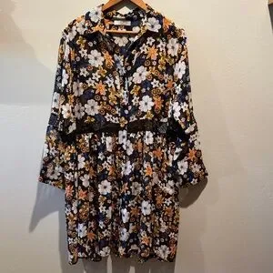 A breezy smock dress with an all-over floral print. Lightweight fabric and a relaxed silhouette for effortless wear. Button-front detail and subtle waist trim add shape. Perfect for casual days and weekend outings in black and mustard tones.