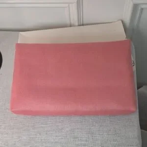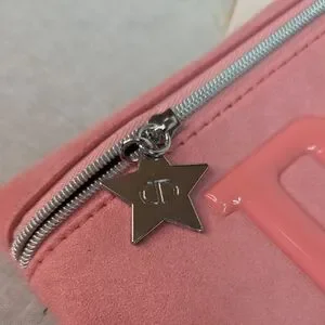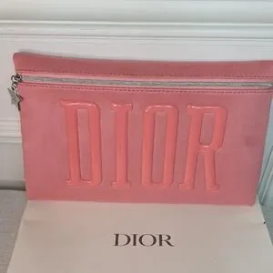 Chic Dior beaute pouch in vibrant pink. Features bold logo design. Ideal for cosmetics.