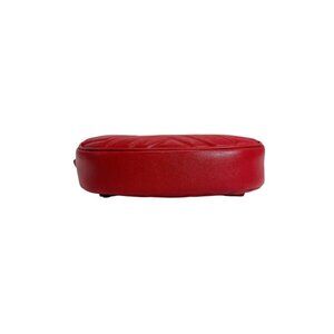 This is an authentic Gucci Marmont body bag in a vibrant red color. The bag features the signature Gucci GG logo hardware, a zip-top closure, and a sleek, quilted leather construction.
