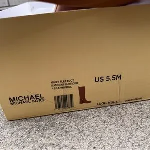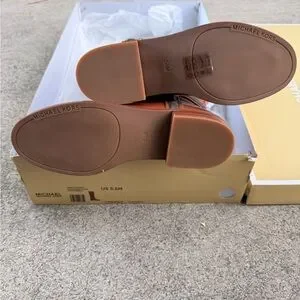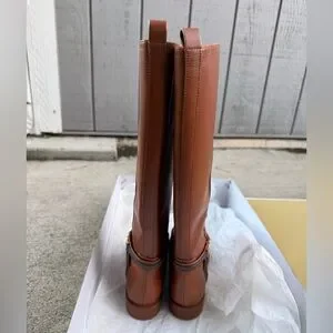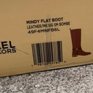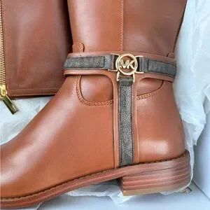 Classic tall leather silhouette with subtle MK logo harness. Smooth upper and low stacked heel. Sleek, versatile style for everyday wear.