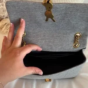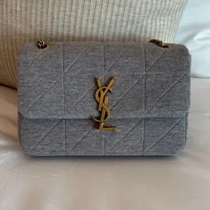 Chic gray quilted design. Iconic YSL logo in gold. Perfect for any occasion.