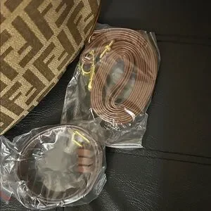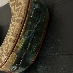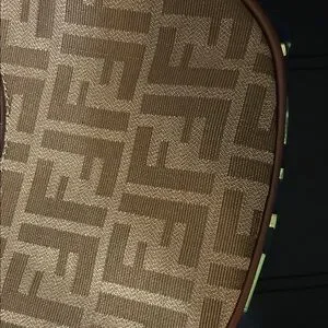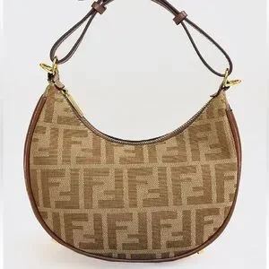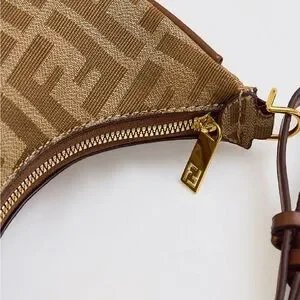 Crescent-shaped shoulder bag in FF monogram canvas. Leather trim and strap accent the silhouette. Gold-tone hardware on zipper and attachments. Compact and chic for day or evening wear.