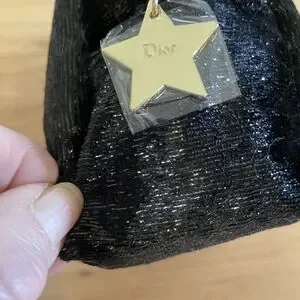 Brand new Christian Dior black shimmer cosmetic pouch featuring a gold-tone CD logo and signature star zipper pull. Stylish fabric exterior with Dior logo interior lining. Perfect for makeup, travel essentials, or small accessories.