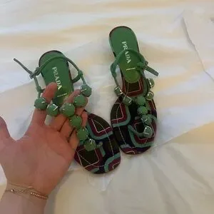 Never worn green suede Prada kitten heeled sandals. The sole has a very Pucci summer print. In perfect condition they just don’t come with a box.