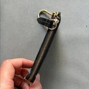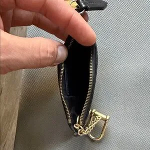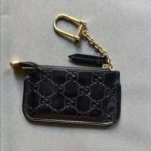 Sleek Gucci key and card holder in embossed GG leather. Features a secure gold-tone clip and zipper pull. Compact design holds keys and a few cards. Timeless luxury accessory for everyday use. Well used. Gold is tarnishing from regular wear