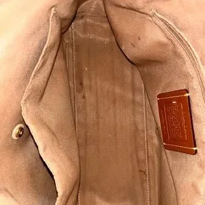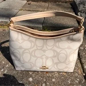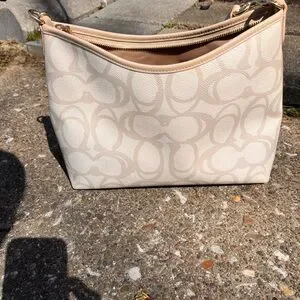 Stylish Coach shoulder bag with signature pattern. Features a chic beige tone. Ideal for daily use.