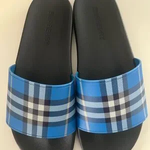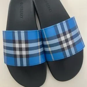Chic slides featuring Burberry's iconic blue check pattern. Comfortable and stylish for everyday wear.