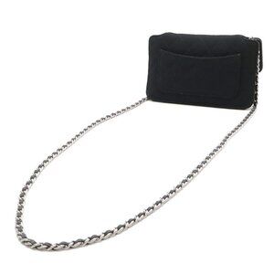 This is an authentic Chanel Wallet on Chain in black. The quilted cotton jersey nylon material features the iconic Chanel logo and a polished silver-tone chain strap for a sophisticated, versatile design.