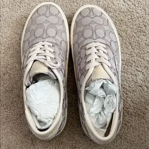 Coach low-top sneakers with signature C canvas. Soft pink upper with tonal laces. Cream rubber sole and subtle logo on tongue. Clean, classic casual style.