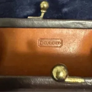 Classic Coach coin purse in smooth brown leather. Features a vintage-style brass kiss-lock clasp. Sleek, compact shape for cards and coins. Timeless, minimalist design.