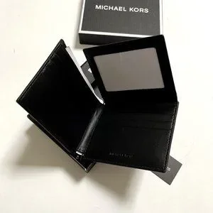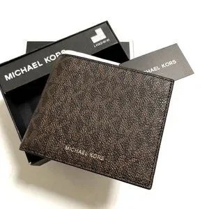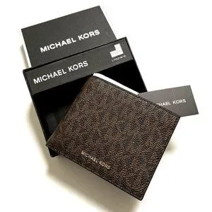 Classic Michael Kors bifold wallet. Monogram pattern in brown tones. Smooth leather trim. Silver logo lettering on front. Sleek, functional design.