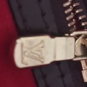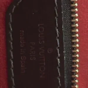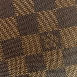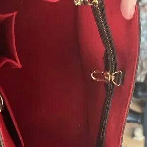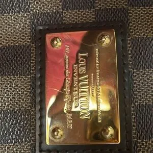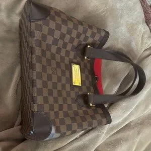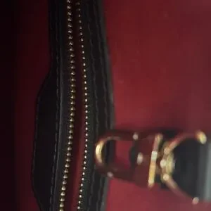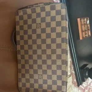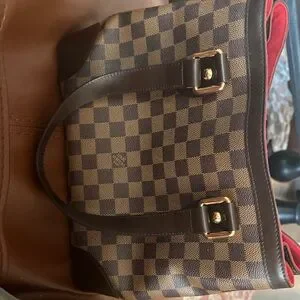 Louis Vuitton tote in Damier Ebene canvas. Dark brown leather trim and double shoulder straps. Gold-tone hardware and nameplate. Red interior lining visible. Elegant and functional everyday bag. I can’t verify authenticity.