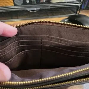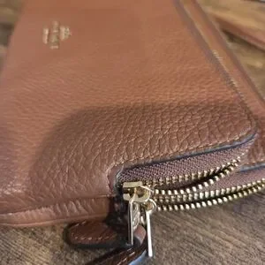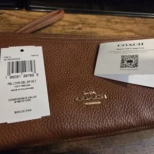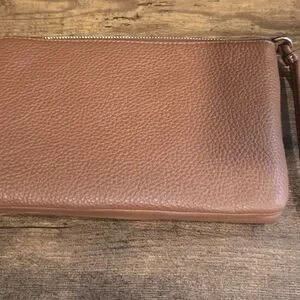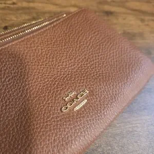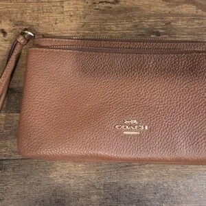 Authentic Coach pebbled leather wristlet with gold-tone logo and hardware. Slim, wristlet style with top zip closure. Classic brown leather finish. Versatile and stylish accessory.