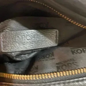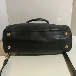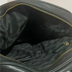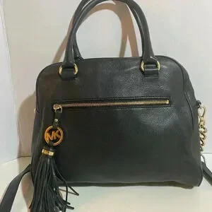 Michael kors Black leather satchel handbag with gold tone hardware main compartment 5 pockets at interior wall 1 zip closure & zip closure at top jacquard fabric lining hangtag at front protective metal foot base minor cracks At strap height 10.5” width 10.5” depth 4” strap drop 6” shoulder strap 25” The dimensions are based on approximately measurements before placing an order please check take a moment to view all photos using feature for a closer look