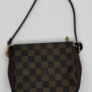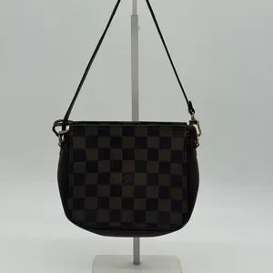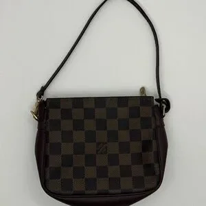 Stylish and compact Authentic Louis Vuitton brown checkered Pochette bag. Practical design with a secure zipper top and leather strap. Brown tones and gold hardware create a warm, classic appeal.