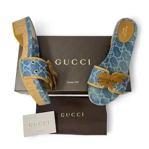 Vintage Gucci denim slides, size EU 38. Includes box, dust bag, and care card.