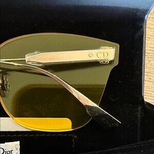 Stylish Dior rimless sunglasses with bold yellow lenses. Gold-tone bridge and temples. Contemporary cat-eye profile for fashion-forward looks.
