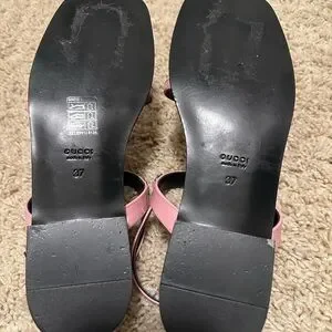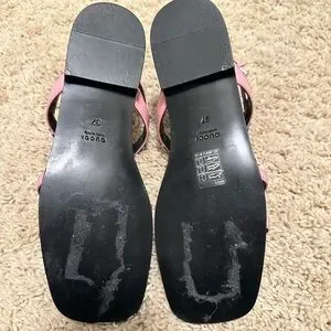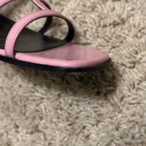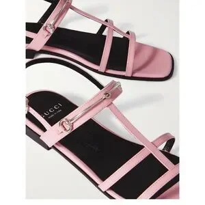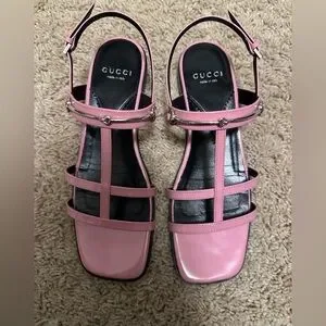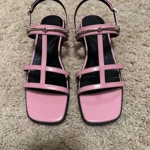 Lightweight pink patent sandals with multiple thin straps. Slingback ankle strap with small buckle. Low block heel and open toe. Subtle silver-tone hardware accents.