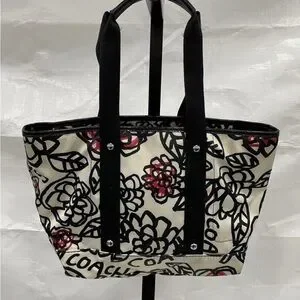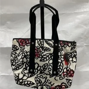 Coach Black & White Floral Satin Tote with Red Accents