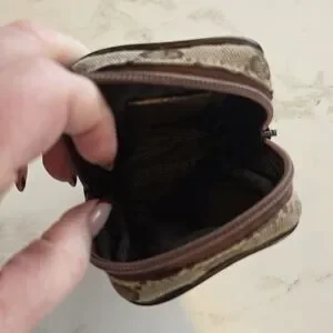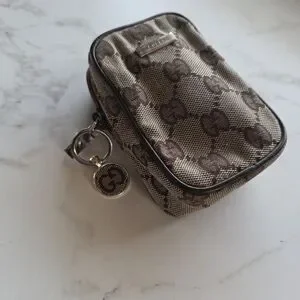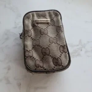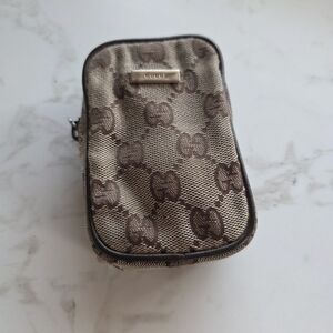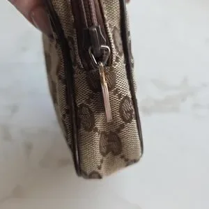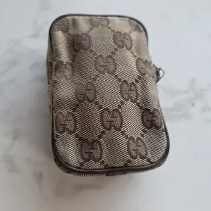 Compact Gucci pouch with iconic GG monogram. Brown and tan woven canvas. Zip closure and leather trim. Versatile small organizer for essentials.
