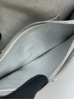 Original condition with no restoration. Silver leather remains clean with no scratches or discoloration. Light wear on corners, chain hardware is bright and smooth. Interior is pristine. Fitted with a microchip (no date code), confirming recent production.