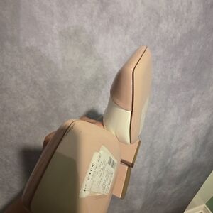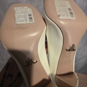 Elegant Prada flats in cream patent leather with blush pink cap-toe. Comfortable low-profile design for everyday wear. Sleek square toe and cushioned insole for all-day support. Versatile cream and blush colors pair well with work or casual outfits.