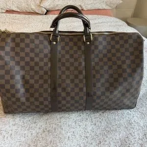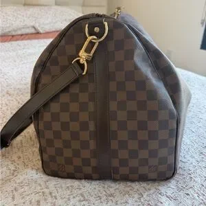 Louis Vuitton Keepall Bandoulière 55. Good condition. Any and all wear is visible in photos. Original Price $2700. The classic LV duffel in Damier Ebene canvas. Rich brown checker pattern with dark brown leather trim. Detachable shoulder strap and rounded top handles. Gold-tone hardware accents.