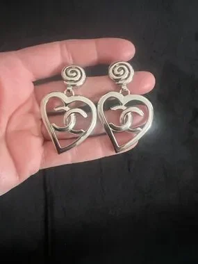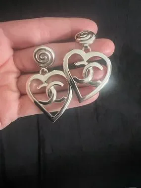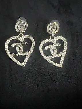 Silver-tone heart drop earrings with interlocking CC motif. Polished finish with subtle shine. Secure post backs for easy wear. Timeless designer silhouette.