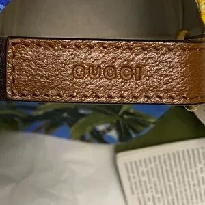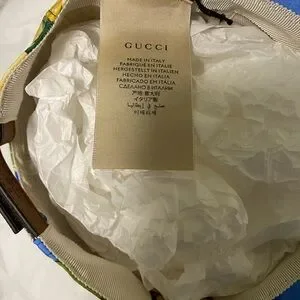Authentic Gucci men’s baseball cap with vibrant tropical print. Bright blue base with yellow hibiscus and green palm motifs. Structured crown and curved brim. Bold designer statement for casual looks.